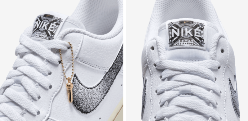 텅부분의 탭에는 클래식한 나이키 로고와 함께 힙합 50주년이라는 로고가 설포 라벨에 새겨져 있습니다. 무난함을 탈피하고자 아웃솔은 비치 색상으로 마감했으며, 래퍼들이 좋아하는 금색으로 제작된 마이크가 행택으로 달려 포인트를 줍니다.